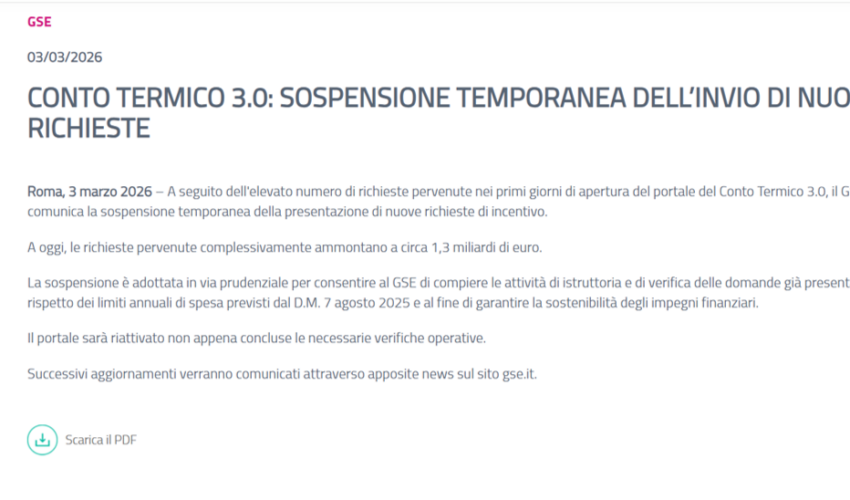 Questa mattina il GSE ha emanato la nota stampa dichiarando che le richieste sono arrivate a 1,3 miliardi di € e per tale motivo sospendono la ricezione delle domande